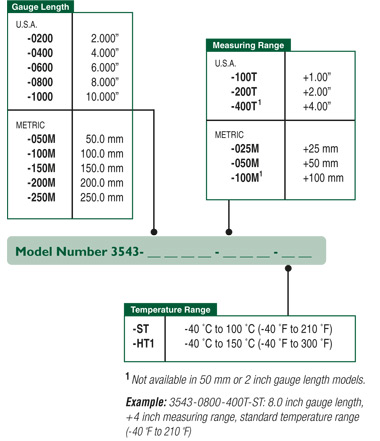 Model 3543 Available Versions: ANY combination of gauge length, measuring range and temperature range listed below is available, except as noted. Intermediate and longer gauge lengths are easily attained by adding gauge length spacers.